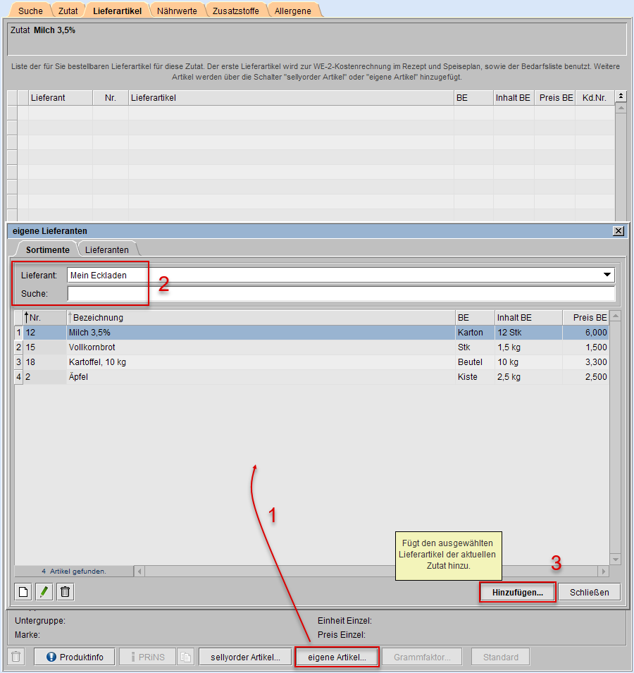 Nachfolgend erhalten Sie den Zutatenpass und nutzen dort die Schaltfläche [eigene Lieferanten...].