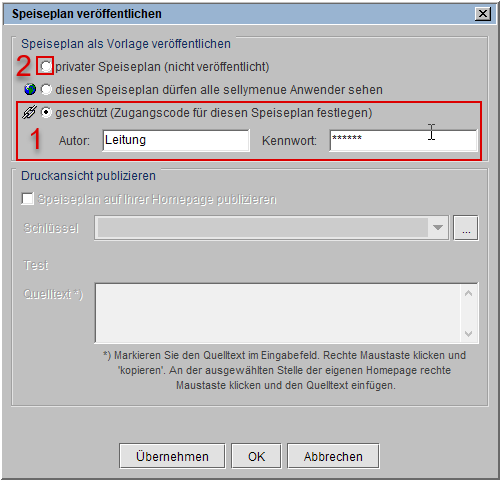 Um einen Speiseplan als geschützte Vorlage zu veröffentlichen, wählen Sie die Option geschützt und definieren einen