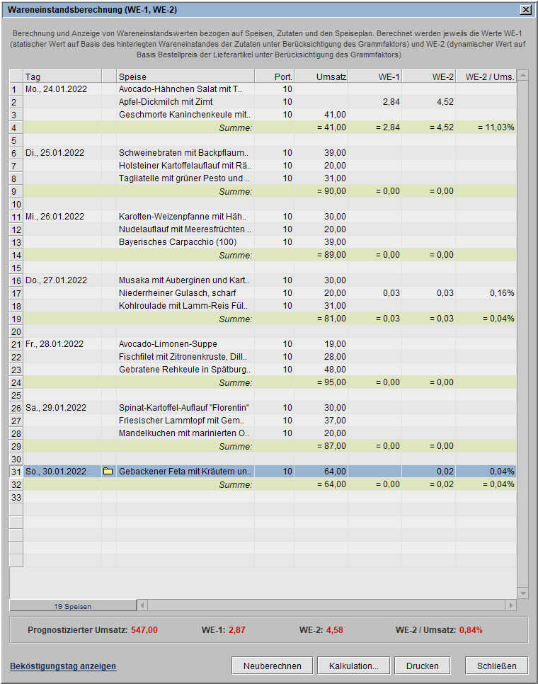 Die tabellarische Übersicht der Wareneinstandswerte zeigt Ihnen pro Speise oder Menü, pro Tag und für den gesamten Speiseplan den nach Ihren Vorgaben berechneten zu erwartenden Umsatz im Vergleich zu den Wareneinständen WE-1* und WE-2** sowie das Verhältnis Ihres Wareneinstandes WE-2 zum zu erwartenden Umsatz.