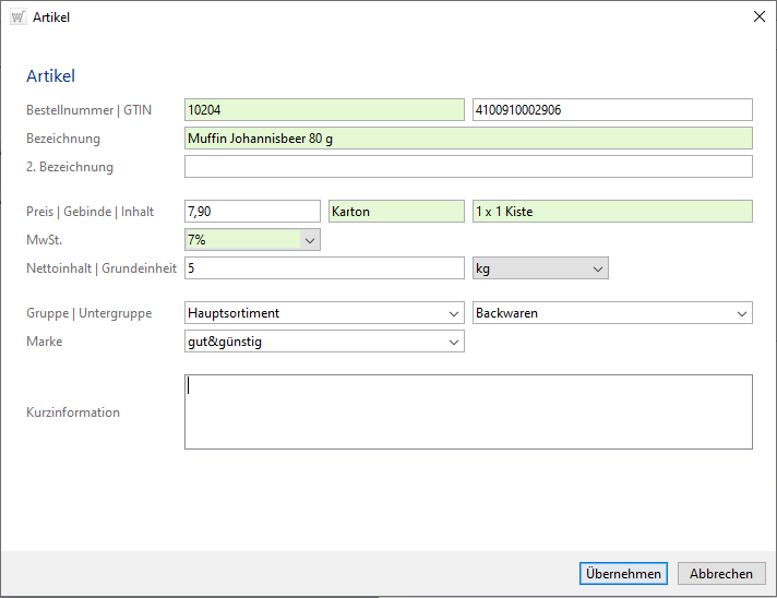 Der Dialog schließt sich automatisch und Sie sehen den Artikel im Dialog Artikel
