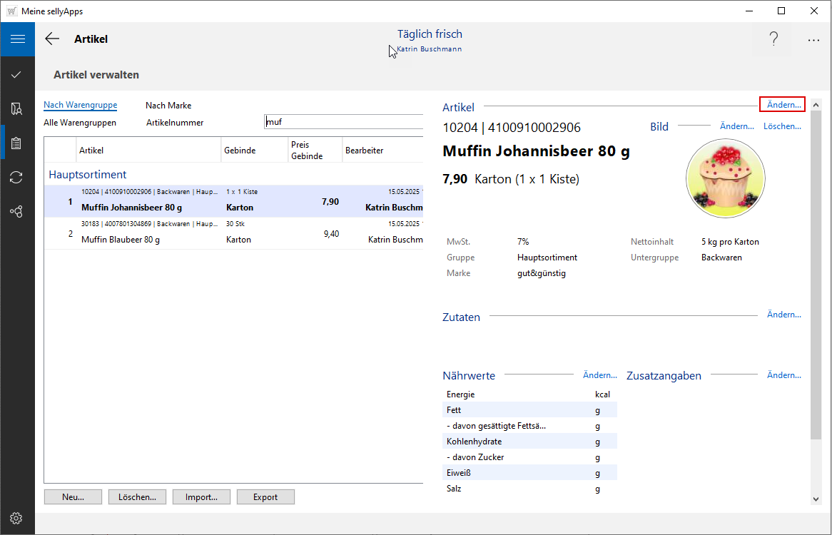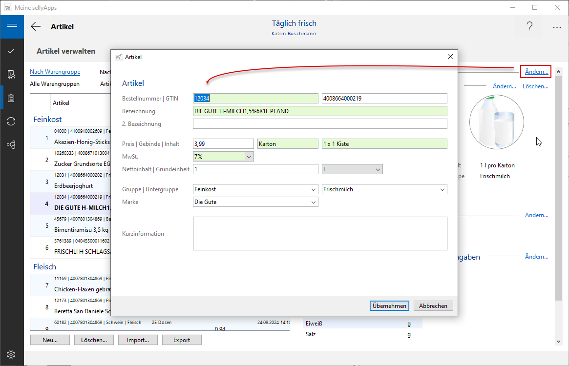 Zum Ändern von Artikelbasisdaten nutzen Sie den Funktionslink [Ändern...] (s. Markierung)