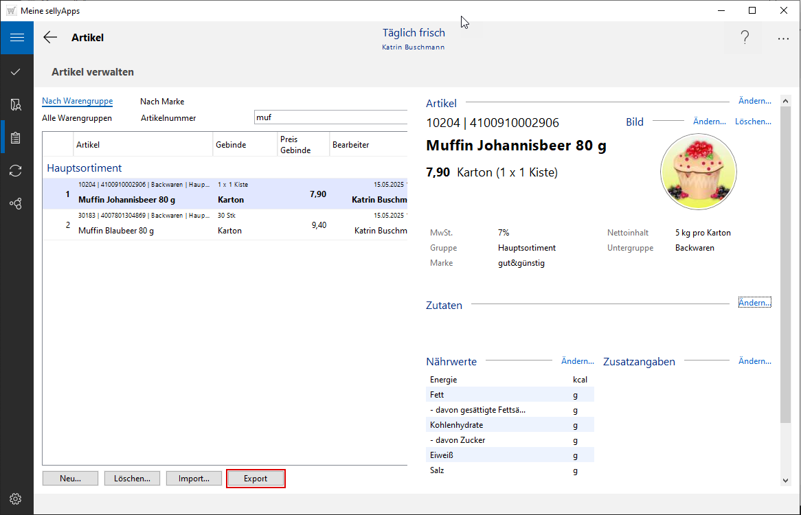 Es werden genau die Artikel exportiert, die Sie in der Artikelliste sehen. Wenn Sie bspw. eine Einschränkung auf eine Warengruppe eingestellt haben (s. u.), erhalten Sie beim Export genau die Artikel, die zu dieser Gruppe gehören. Ebenso gilt dies für die gewählte Sortierung der Liste.