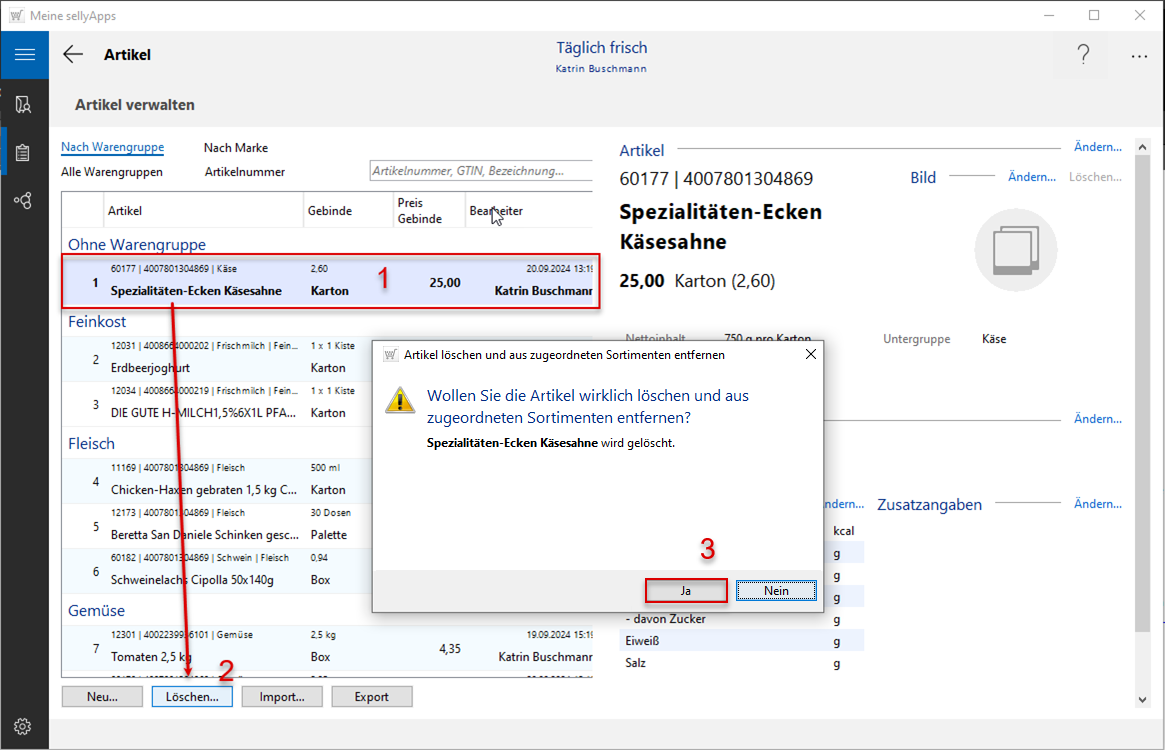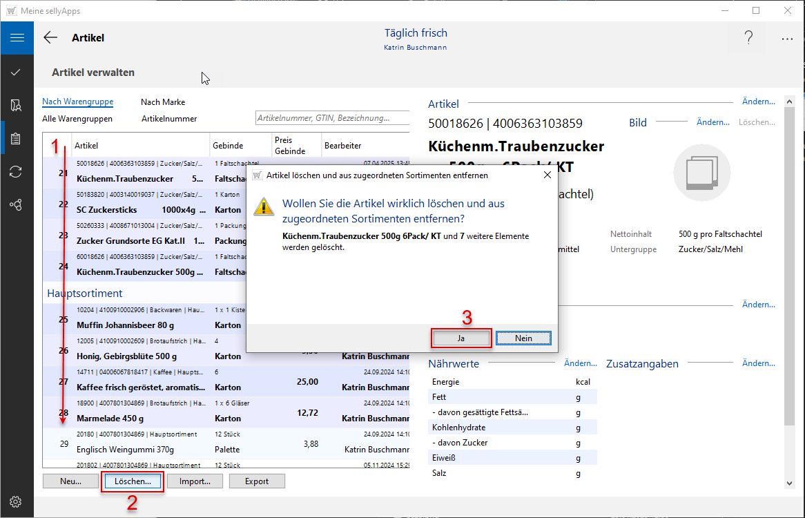Zum gleichzeitigen Löschen mehrerer Artikel, müssen die Zeilen über- oder untereinander liegen (zusammenhängend), damit diese zusammen markiert werden können (s. r. Markierung 1). Sie klicken dazu den ersten Artikel an und nachfolgend mit der Kombination Shift-Taste + linke Maustaste den letzten Artikel, der gelöscht werden soll. Nachfolgende Schritte sind analog dem Löschen eines einzelnen Artikels (s. r. Markierungen 2+3).