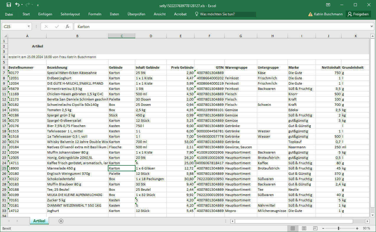 Ihren gesamten Artikeldatenpool können Sie exportieren. Sie nutzen die Schaltfläche [Export], erhalten eine Excel-Datei und können diese ggfs. zur Weiterverarbeitung, zur Aktualisierung oder zum erneuten Import nutzen.