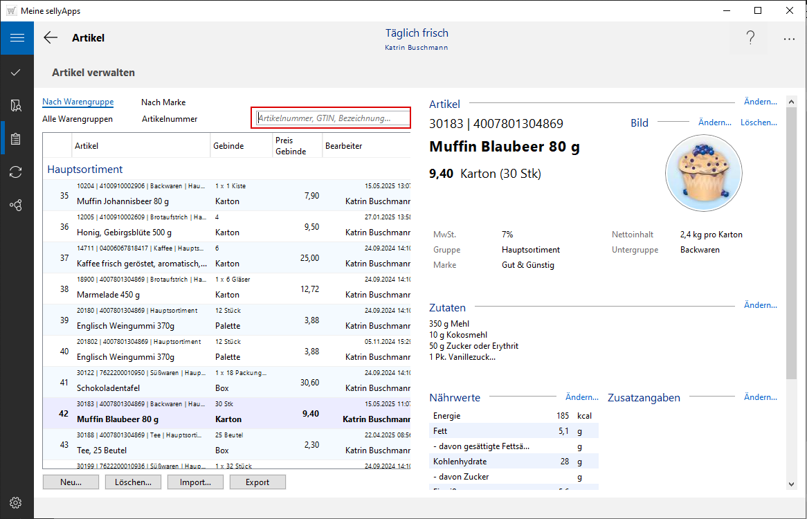 die Artikelbezeichnung oder die GTIN ein bzw. Teile des
