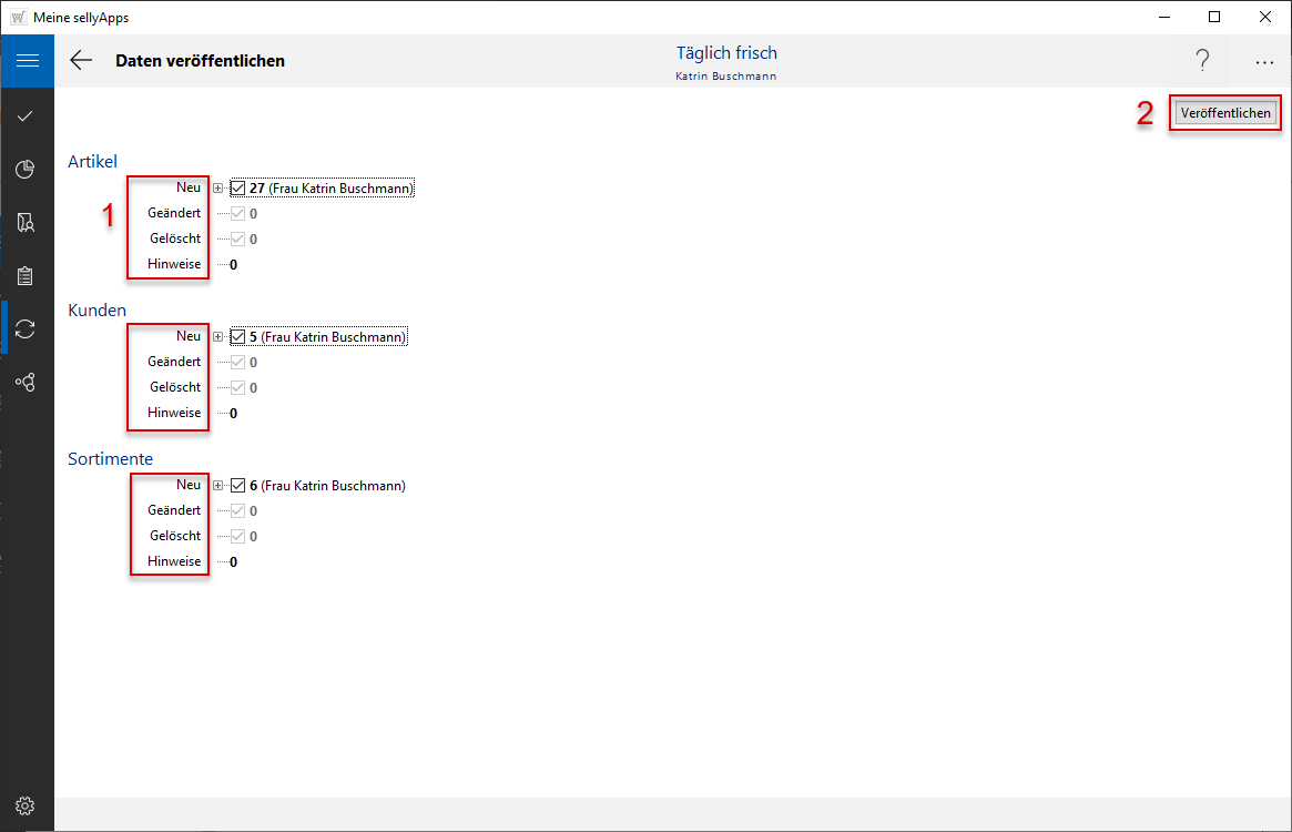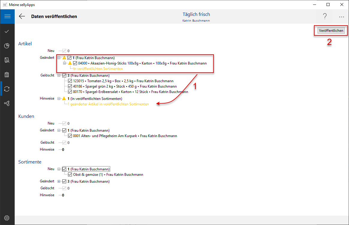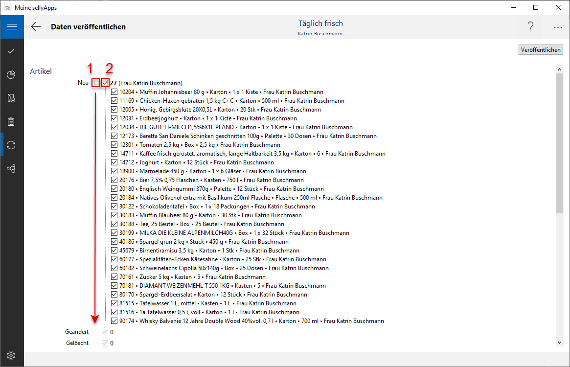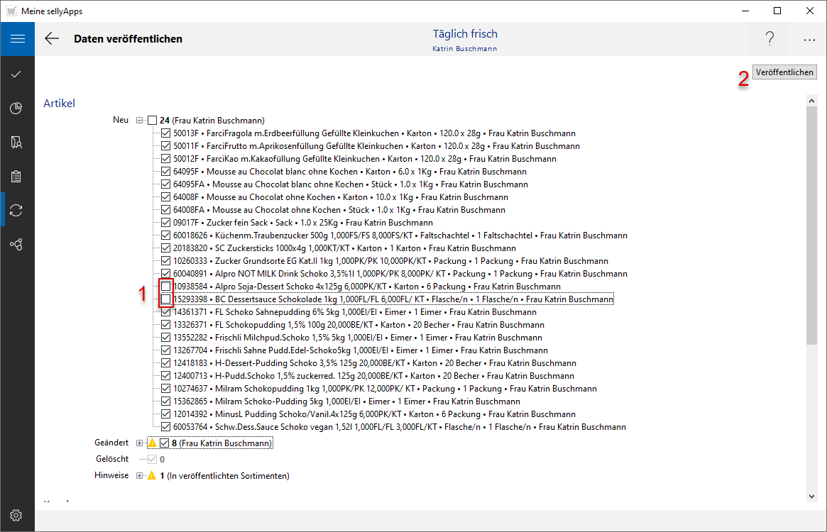 Im Bildbeispiel links (s. Markierung 1) ist ein Artikel abgewählt, d. h. das Häkchen wurde entfernt. Damit werden die Änderungen bzw. im Bildbeispiel die zwei neu erfassten Artikel nicht veröffentlicht. Alle mit dem Häkchen versehene Artikel werden mit Klick auf die gleichnamige Schaltfläche veröffentlicht (s. Markierung 2).