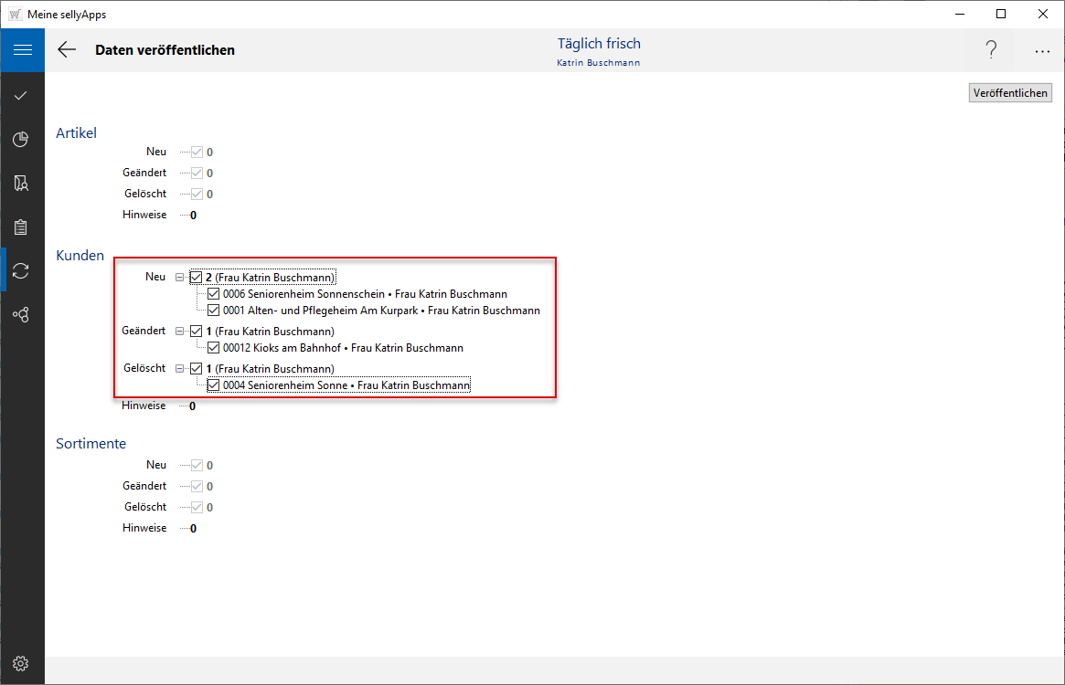 Im Dialog Daten veröffentlichen sehen Sie die Kategorien Artikel, Kunden und Sortimente. Die Daten werden je nach
