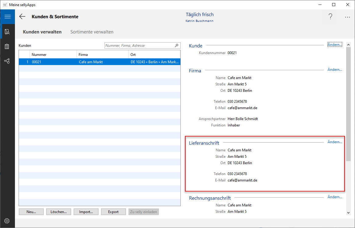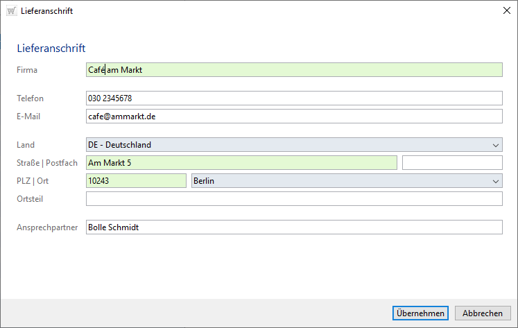 Im Dialog Lieferanschrift (s. Bild r.) sehen Sie die bei der Neuaufnahme des Kundendatensatzes eingetragenen