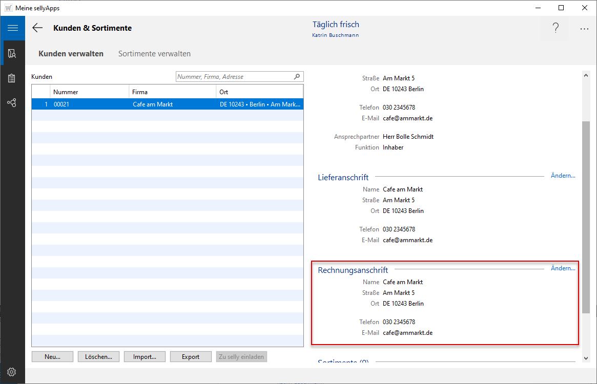 Im Bereich und Dialog Rechnungsanschrift (s. Bild l.) sehen Sie die bei der Neuaufnahme der Kundendaten eingetragenen bzw. die importierten Adressdaten. Für Anpassungen verfahren Sie analog der Lieferadresse. Sollte es keine Abweichungen zur Firmenadresse geben, belassen Sie die vorangetragenen Angaben.