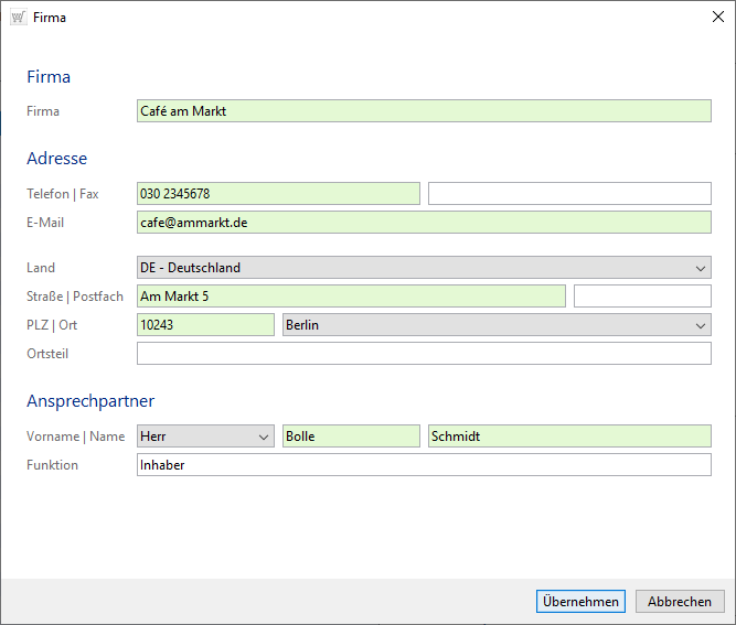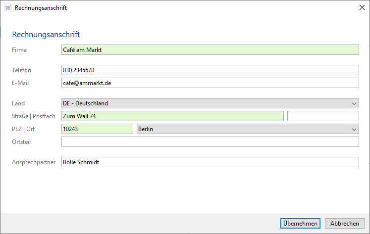 Mittels Schaltfläche [Übernehmen] werden diese Informationen im Dialog Kunden verwalten angezeigt (s. l.). Wählen Sie [Abbrechen], erhalten Sie keine Nachfrage, somit ist die Eingabe verloren.