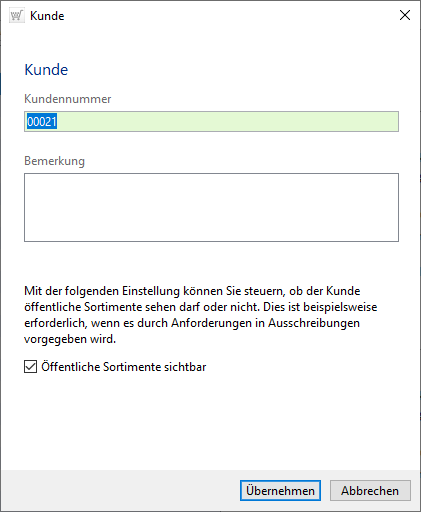 In diesem Bereich sehen Sie die Kundennummer und, falls Sie bei der Aufnahme der Kundendaten eine Bemerkung hinterlegt hatten, diese in den gleichnamigen Feld. Die Änderung der Kundennummer führt automatisch zum Prüfen auf Vorhandensein. Eine Bemerkung kann hier nachgetragen bzw. eine vorhandene geändert werden.