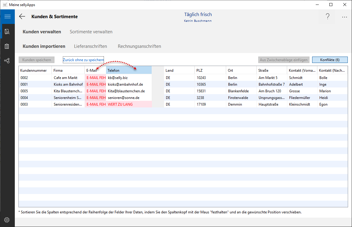 Zur Fehlerbehebung werden die Spaltenköpfe E-Mail und Telefon im Bildbeispiel getauscht. Ziehen Sie dafür die Spaltenüberschrift an die richtige Stelle (s. Markierung Bild r.)