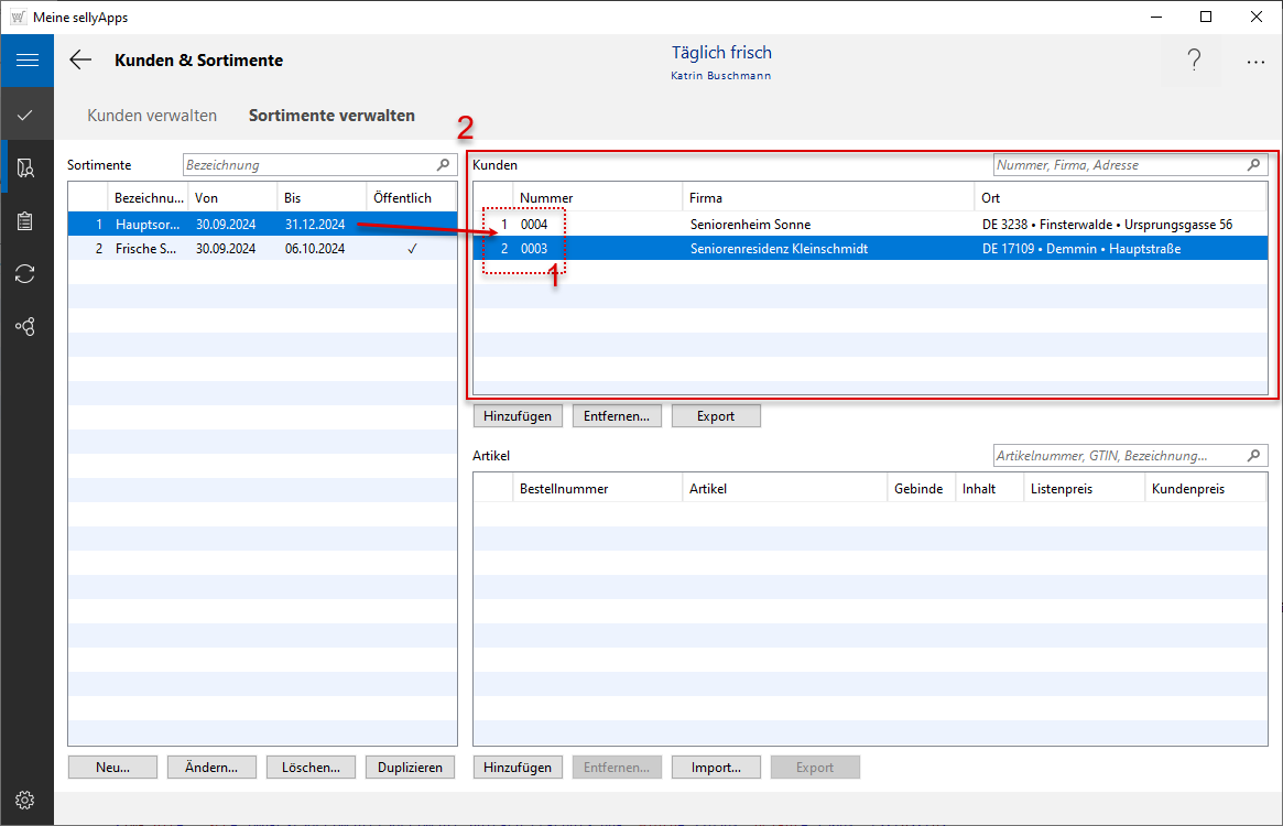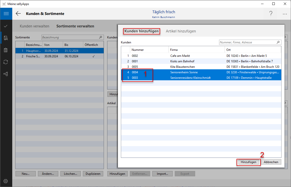 Sie wählen das entsprechende Sortiment in der Liste (s. l. Markierung 1) und klicken auf [Hinzufügen] (s. l. Markierung 2).