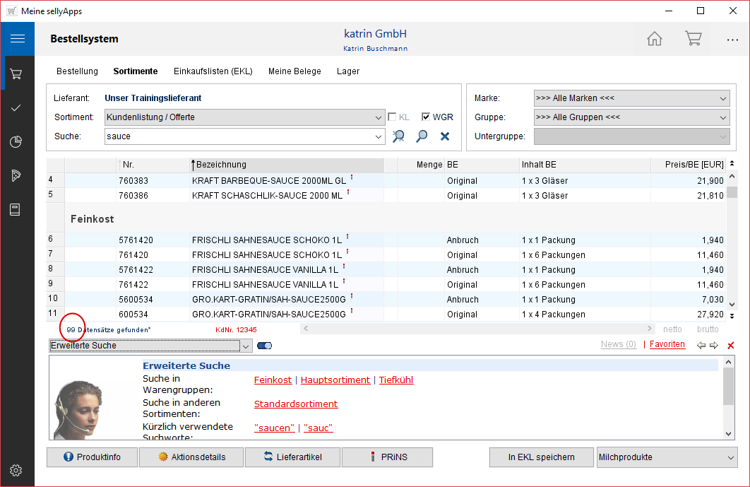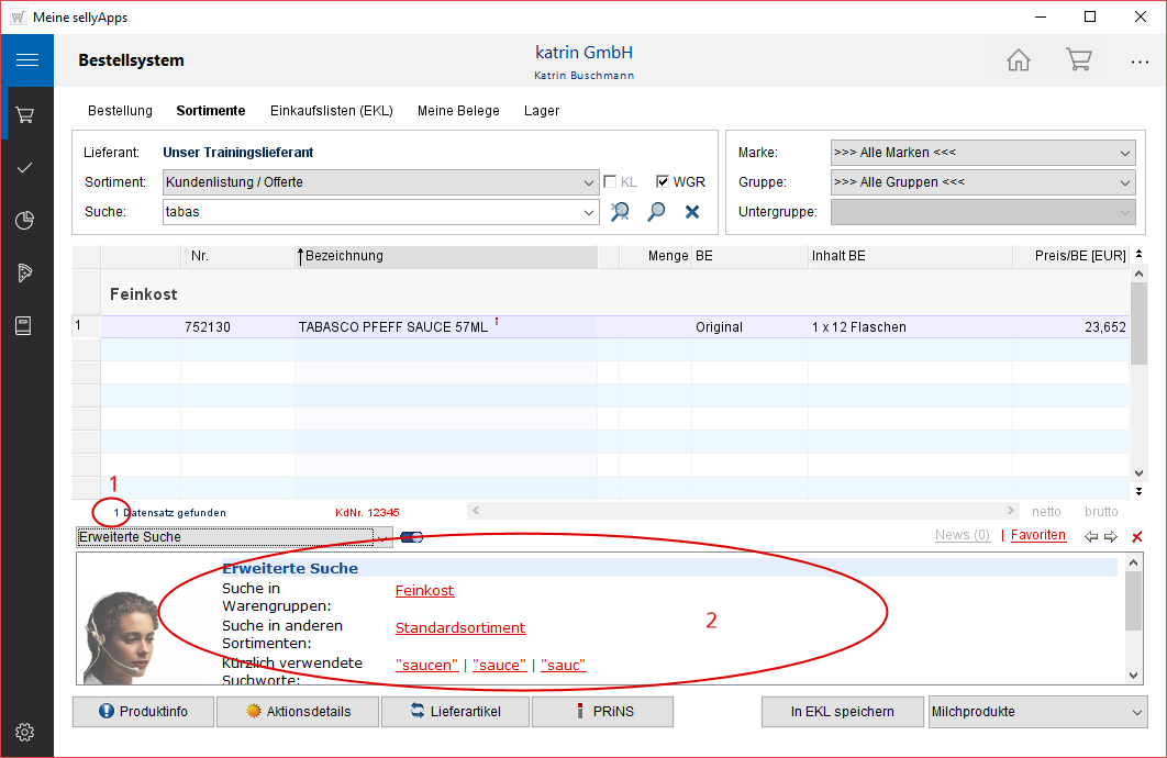 Markierung 2) enthalten genau die Warengruppen, die für das Suchwort ein Ergebnis liefern würden.