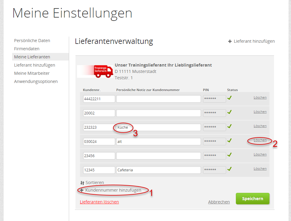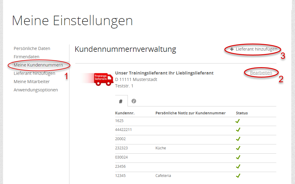 Zum Bearbeiten von Kundennummern nutzen Sie jeweils zuerst den gleichnamigen Link (s. Markierungen 2) und erhalten den Bearbeitungsmodus.