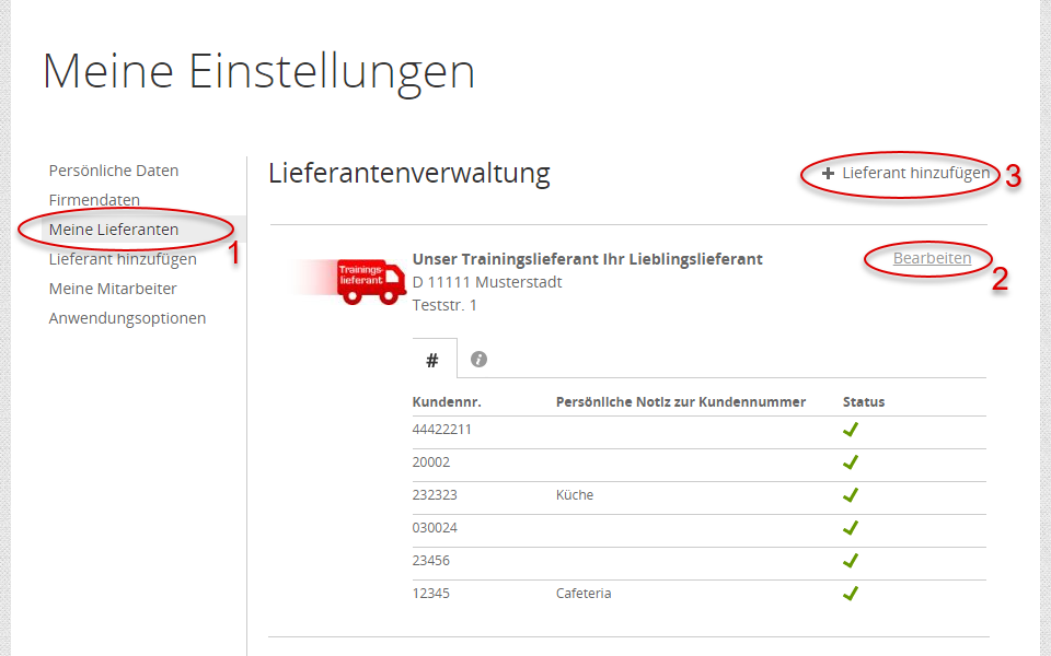 Nach Anwahl des Navigationspunkte Meine Kundennummern (s. l. Markierung 1) oder Meine Lieferanten (s. r. Markierung 1), sehen Sie die bereits zugeordneten Kundennummern und im Aufruf Meine Lieferanten auch alle Lieferanten angezeigt.