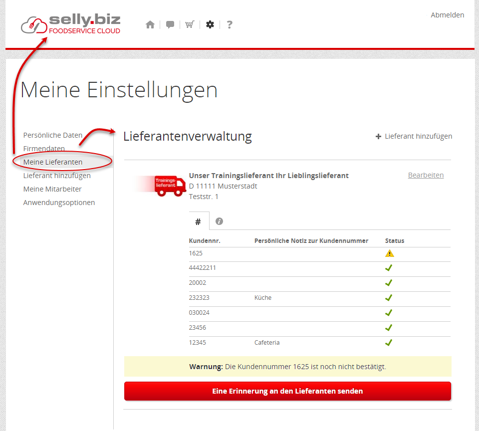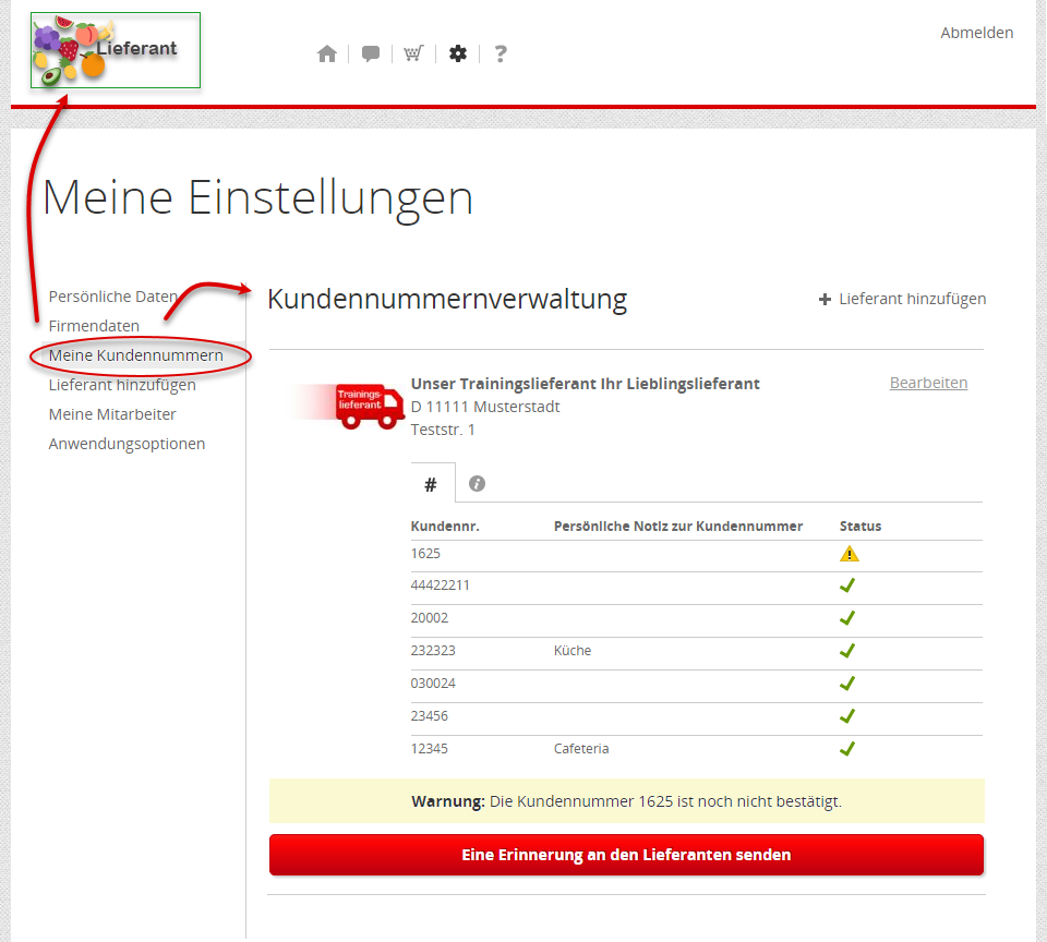 Systemmeldung: Die Kundennummer (1625) ist noch nicht bestätigt (s. Markierung 1 + 2).