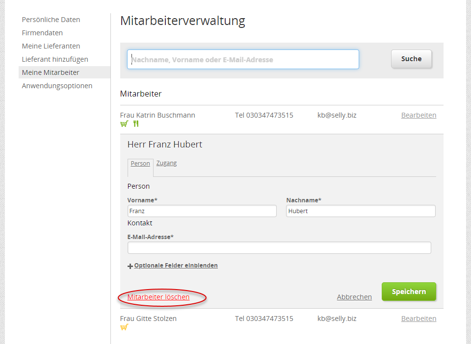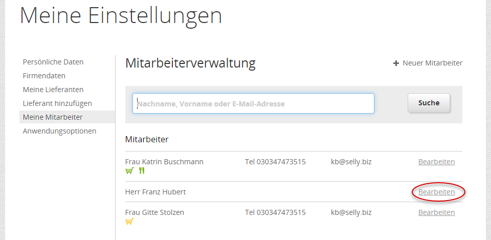 In der Mitarbeiterverwaltung sehen Sie alle Mitarbeiter, die zu Ihrem Benutzerkonto gehören und wählen über [Bearbeiten] den Mitarbeiter/ Stellvertreter, den Sie entfernen möchten.