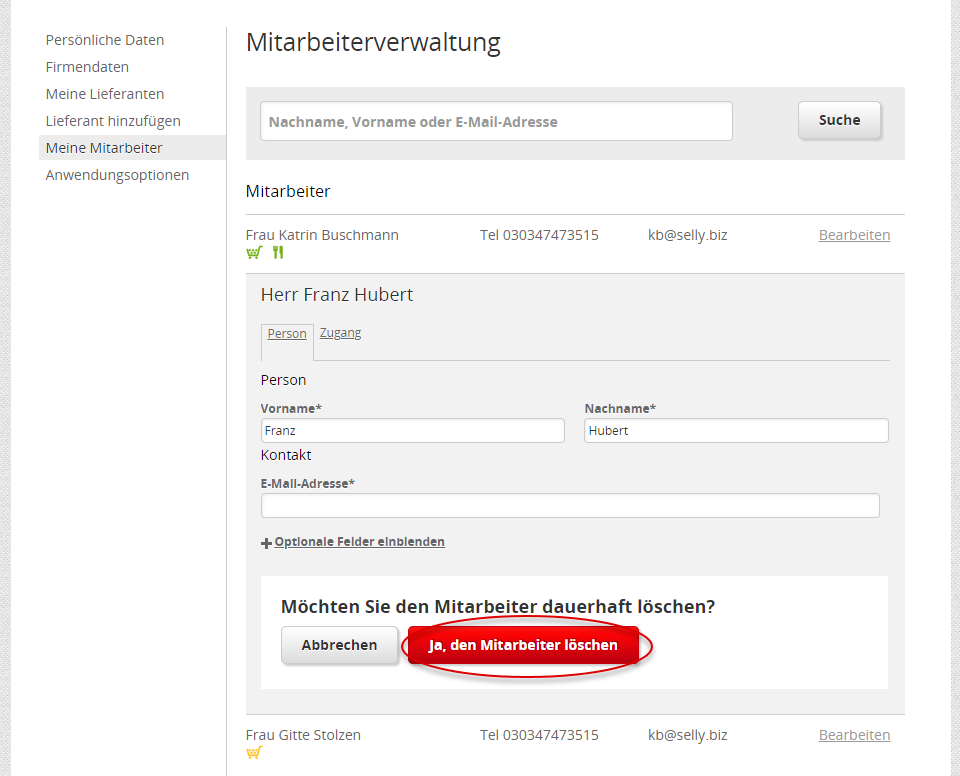 Mittels [Ja, den Mitarbeiter löschen] beenden Sie den Löschvorgang.