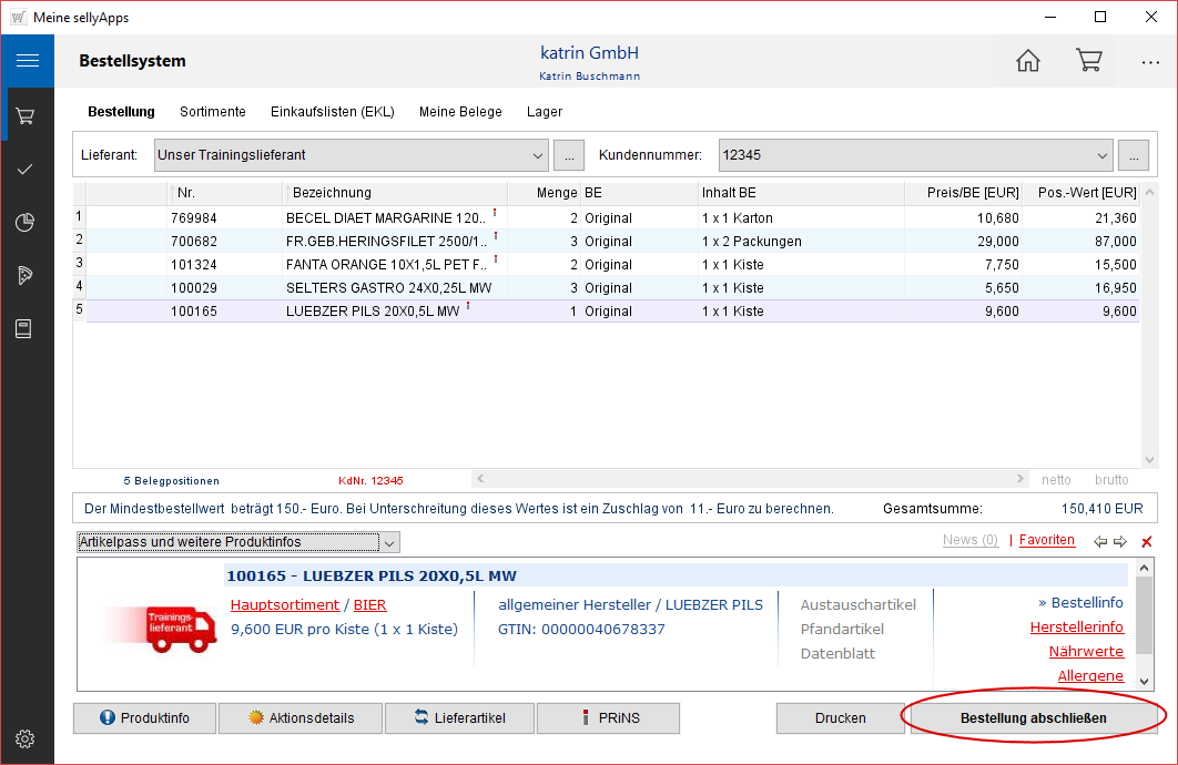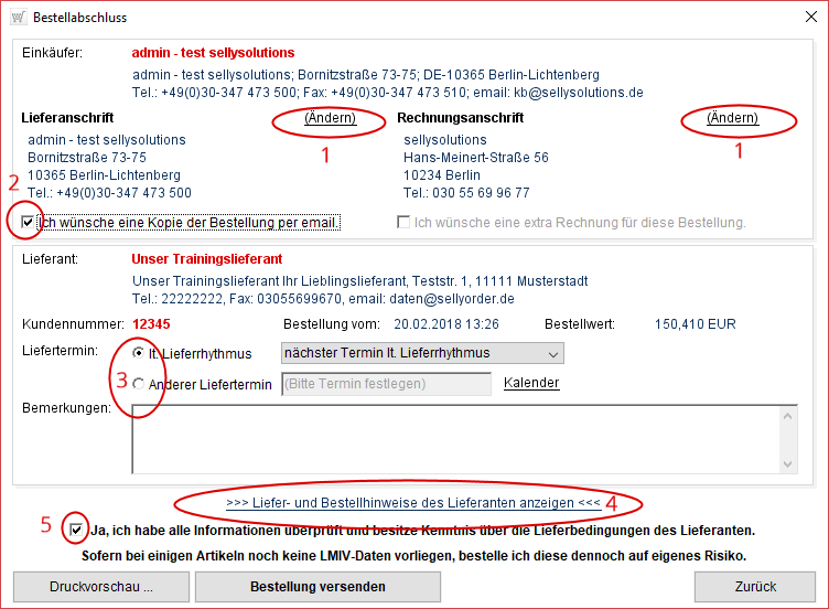 Im Dialog Bestellabschluss (s. Bild links) sehen Sie im oberen Bereich die Einkäufer- und im unteren Bereich die Lieferantendaten.