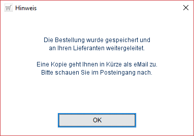 Nach Drücken der Schaltfläche [Bestellung versenden] wird Ihre Bestellung zum Lieferanten geschickt. Sie erhalten ebenfalls eine Kopie der Bestellung.