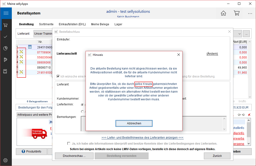 abgeschlossen werden. Ein gelbes Kreuz zeigt an, dass dieser Artikel