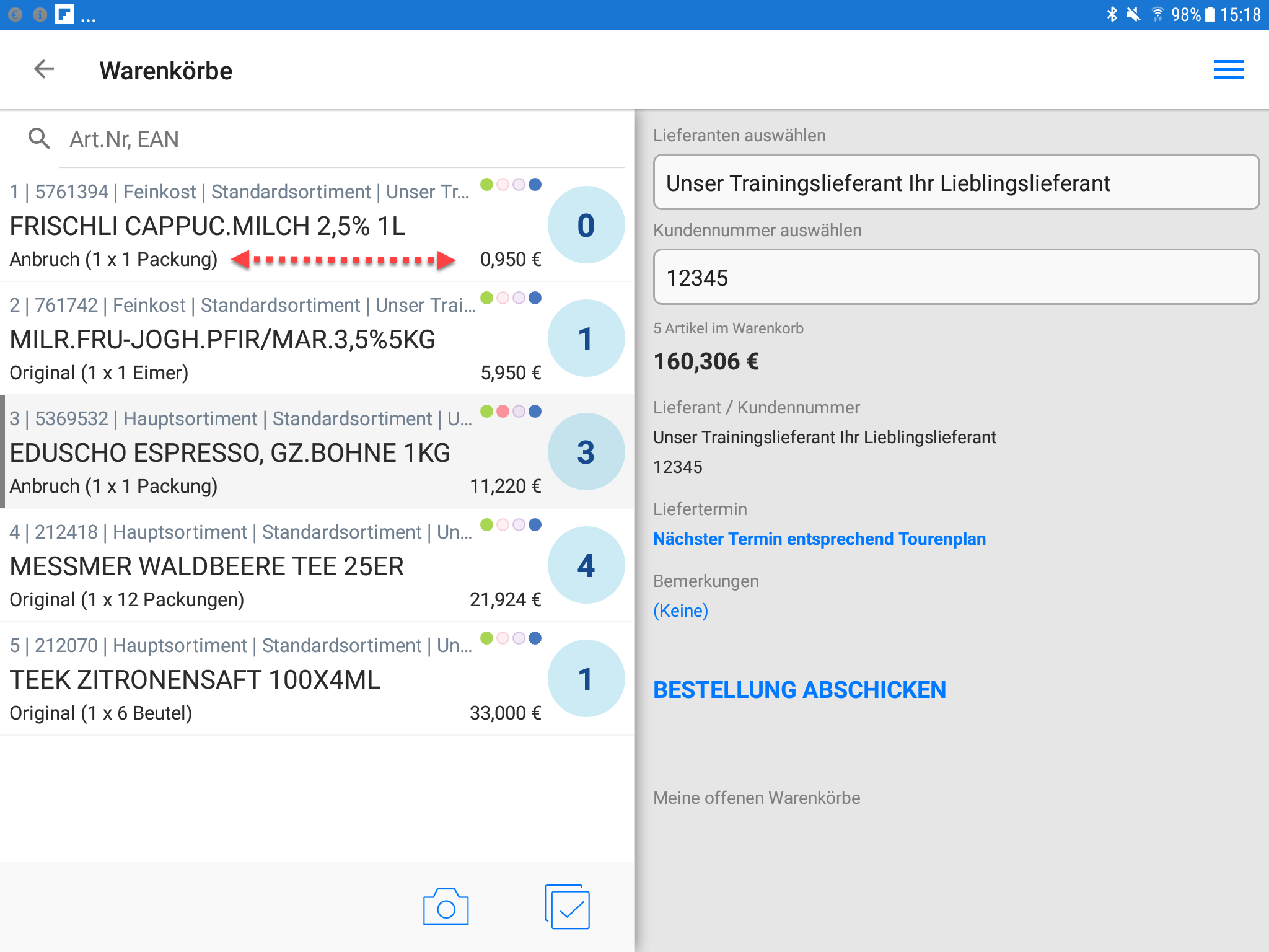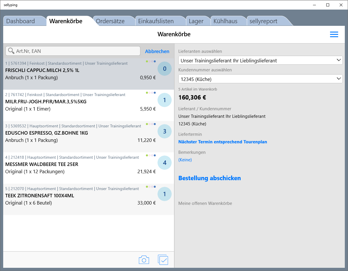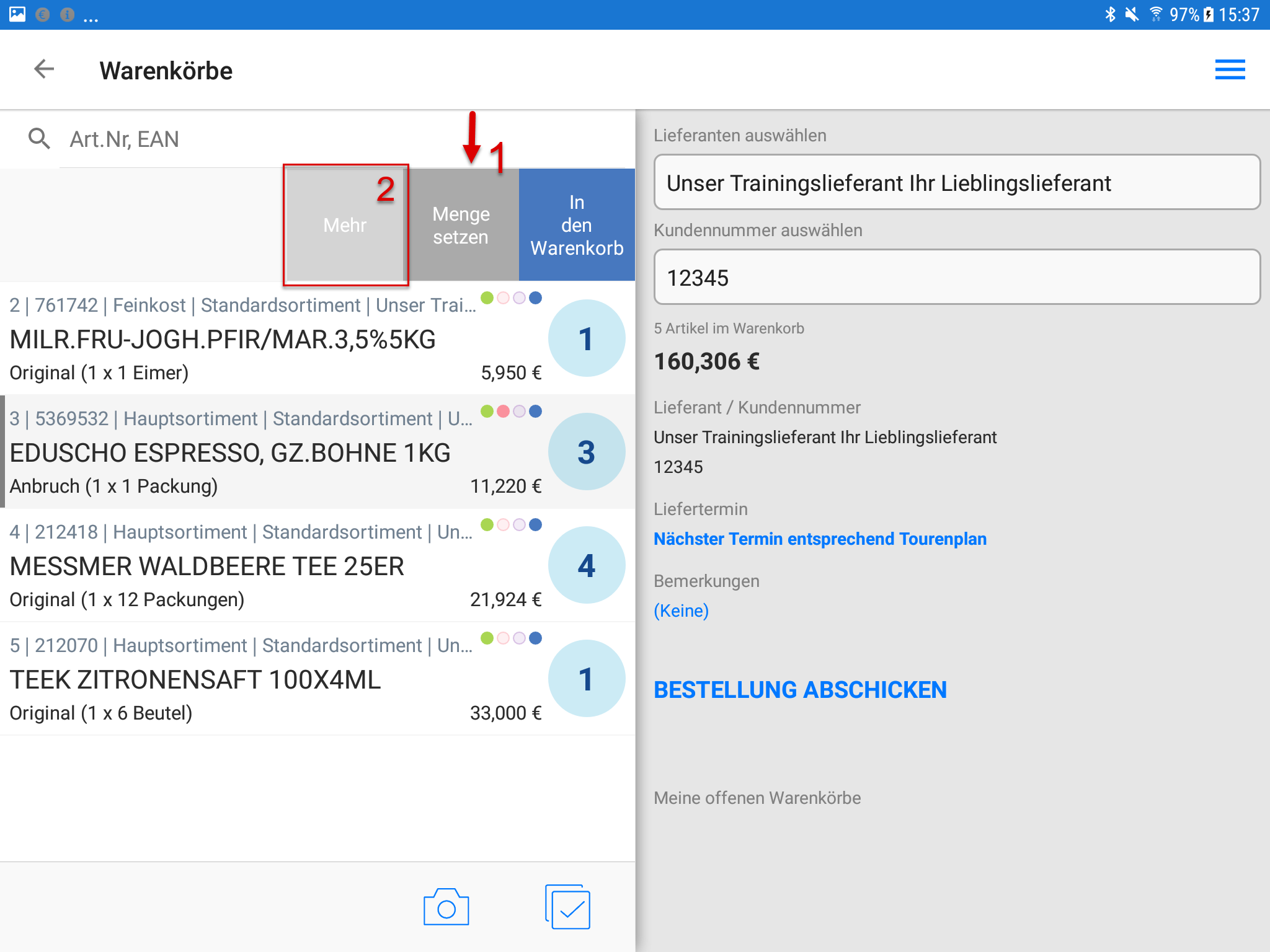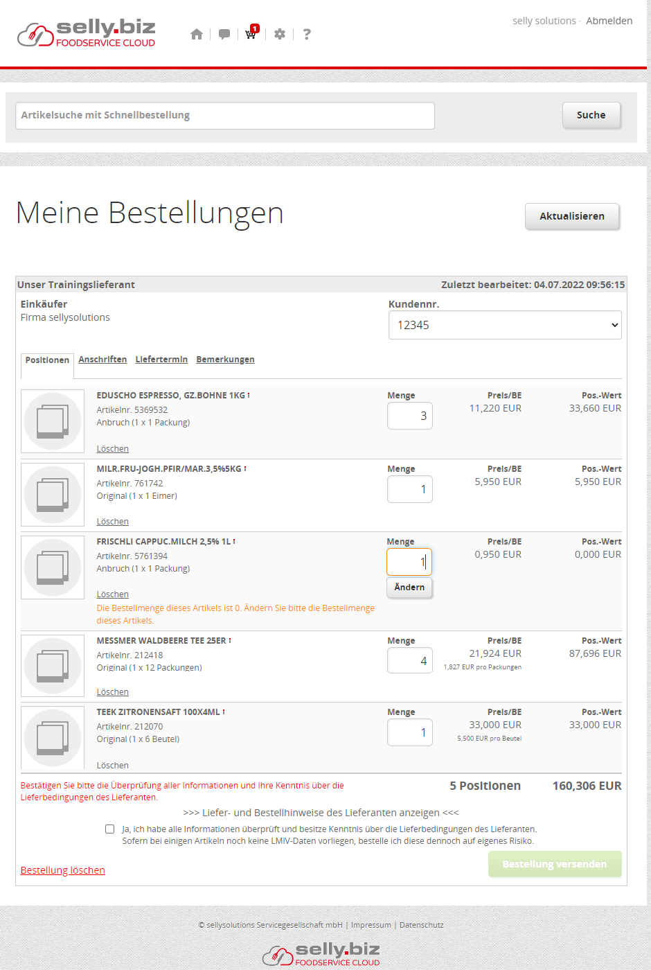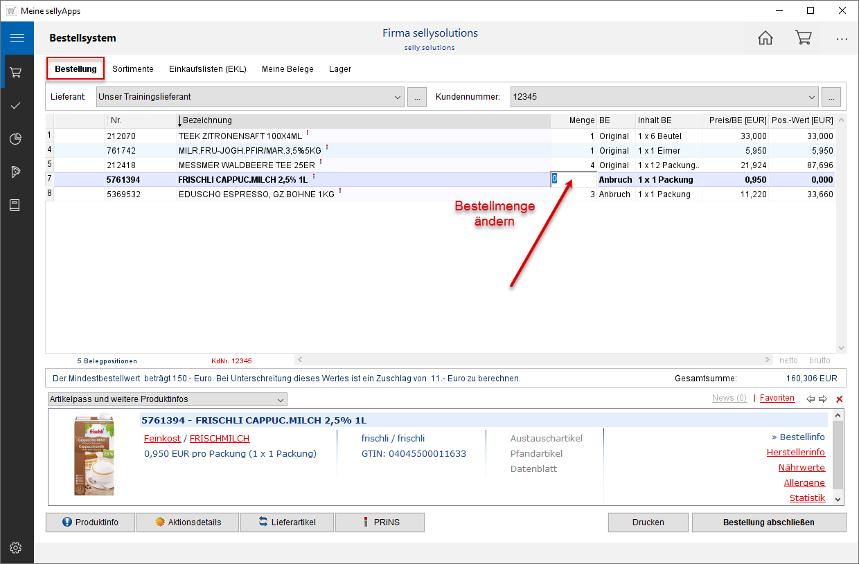 Sie können durch Klick in die Spalte Menge die Bestellmenge ändern.