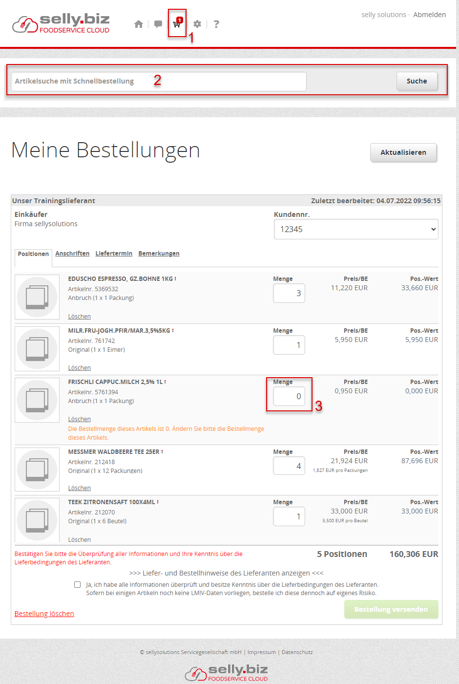 zu übernehmen bzw. die Menge zu ändern, tragen Sie die Bestellmenge ein (s. Markierung 3) und klicken auf den Wagenkorb.