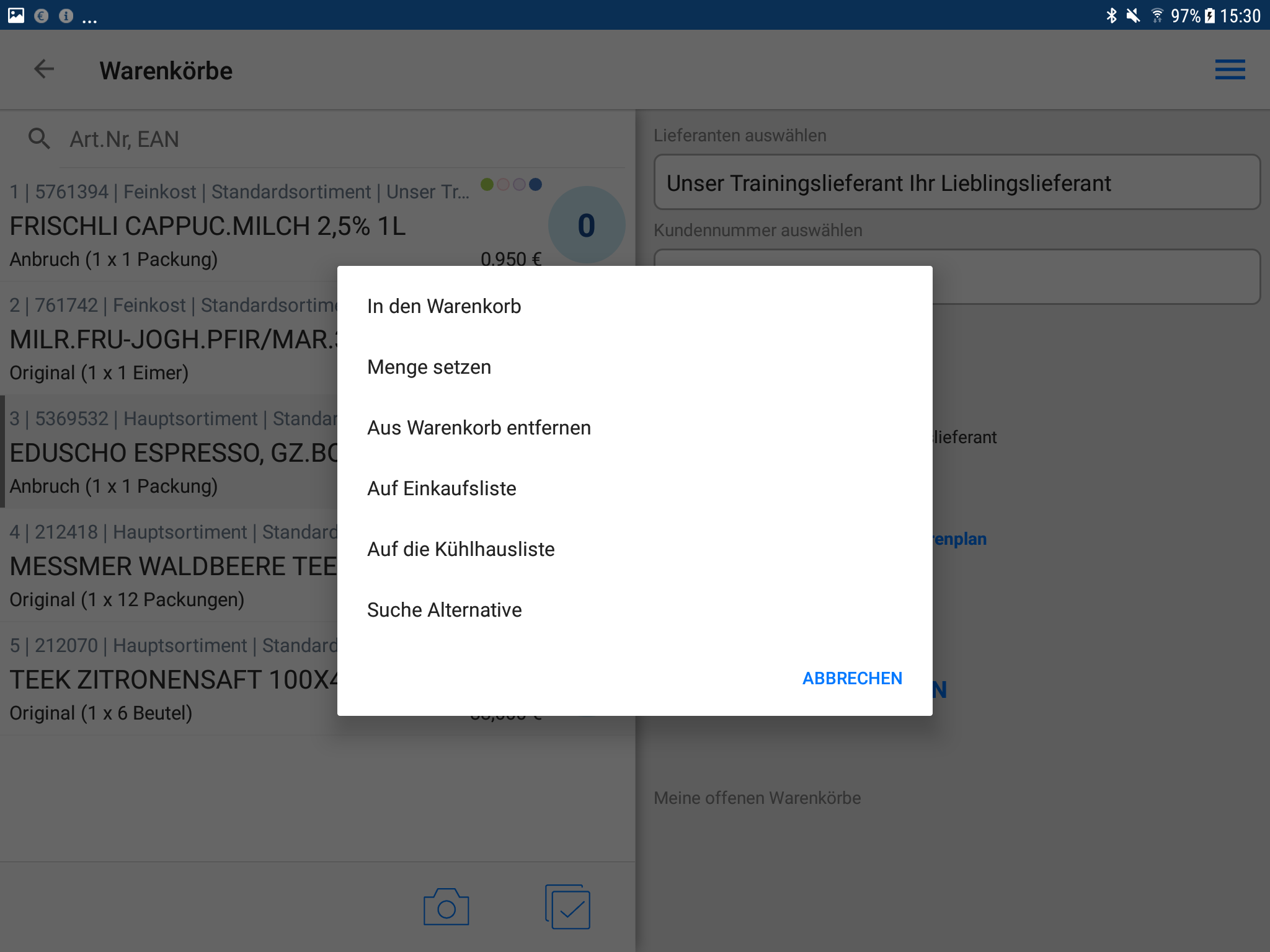 Sie markieren die Position(en) in der Bestellliste und betätigen [Entf]-Taste bzw. die rechte Maustaste. Mit Auswahl des Menüpunktes Bestellposition löschen entfernen Sie diese Position(en) aus Ihrer Liste.