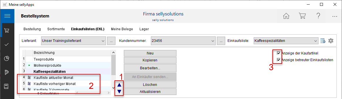 Die vom System generierten Kauflisten und die vom Disponenten oder Lieferantenbetreuer zur Verfügung gestellten Einkaufslisten (s. Markierung 2), können nicht bewegt werden. Diese Einkauflistenkategorien stehen immer am Ende der Liste und können mittels Checkboxabwahl ausgeblendet werden (s. Markierung 3).