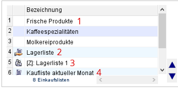Die Reihenfolge der Anzeige der Einkaufslisten kann vom Ihnen selbst bestimmt werden. Durch die Pfeiltasten (s. Markierung 1) werden die Listeneinträge jeweils um einen Schritt nach oben bzw. unten verschoben.