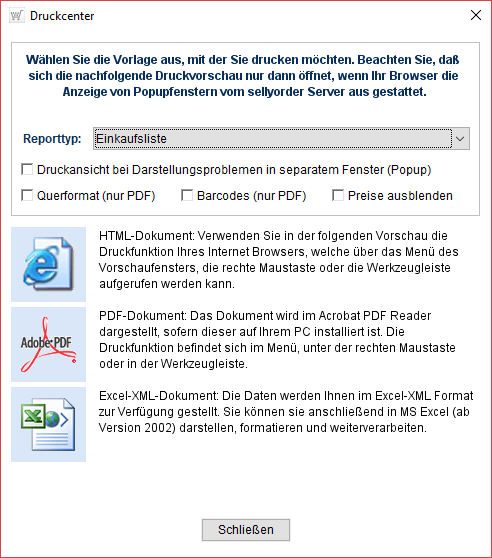 Nachfolgend wählen zwischen den vier Druckoptionen: mit/ohne Preise, mit Barcodes und als Inventurliste, öffnen somit das Druckcenter und wählen dort den Reporttyp, das gewünschte Format und weitere Optionen aus.