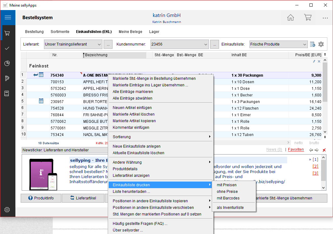 Sie markieren in der Liste die Einkaufsliste, die Einkaufsliste, die Sie drucken möchten. Mit Rechtsklick in die Artikelliste, wird das Kontextmenü aufgerufen. Sie klicken den Eintrag Einkaufsliste drucken an.