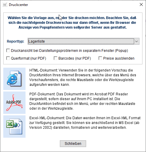 Sie entscheiden sich für die Lagerliste mit oder ohne Preisen und mit bzw. ohne Barcodes.