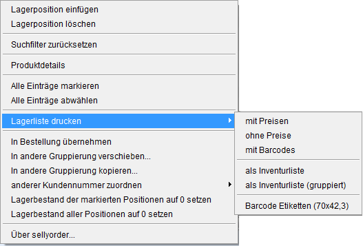 Über das Rechte-Mausmenü erreichen Sie zusätzliche Funktionen, die es Ihnen ermöglichen u. a. die gesamte Liste zu markieren bzw. demarkieren, eine Lagerliste mit und ohne Preise, mit Barcodes oder als Inventurlisten auszudrucken. Haben Sie