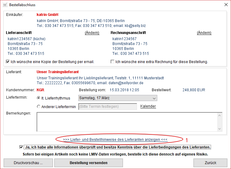 Im Dialog Bestellabschluss, welchen Sie im Bereich Bestellung über die Schaltfläche [Bestellung abschließen] erhalten, sind die Liefer- und Bestellhinweise des Lieferanten ebenfalls ersichtlich (s. u. Markierung 1).