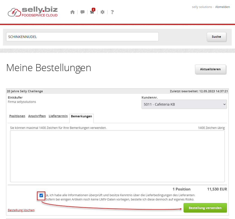 Hinweise oder Bemerkungen zur Bestellung tragen Sie in das Feld Bemerkungen ein. Auch diese Notizen erhält Ihr Lieferant mit der