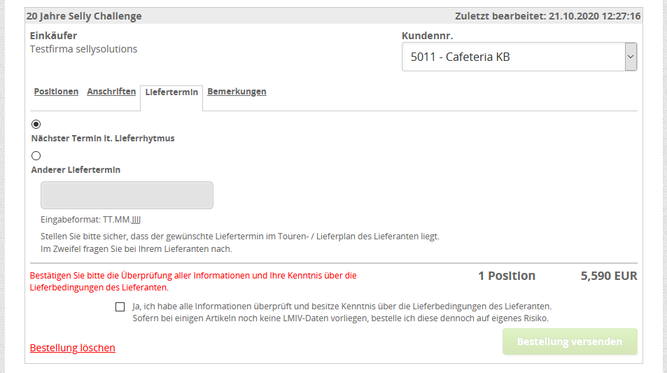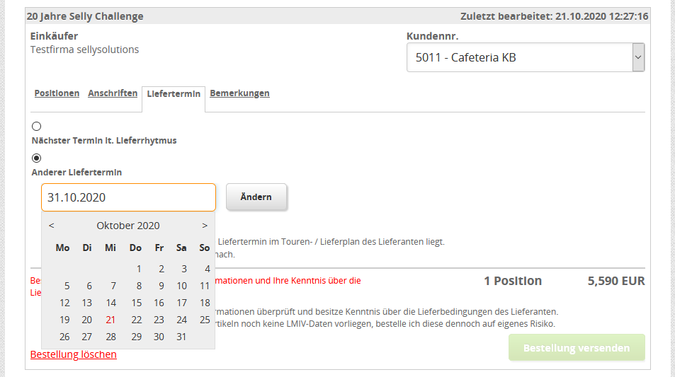 Liefertermin und geben das Datum in das Feld ein bzw. wählen das Datum in der Kalenderansicht aus (s. Mouseover im Bild).