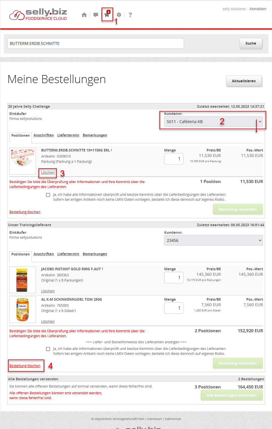 Einzelne Bestellpositionen entfernen Sie mit Klick auf den Link Löschen (s. Markierung 3).