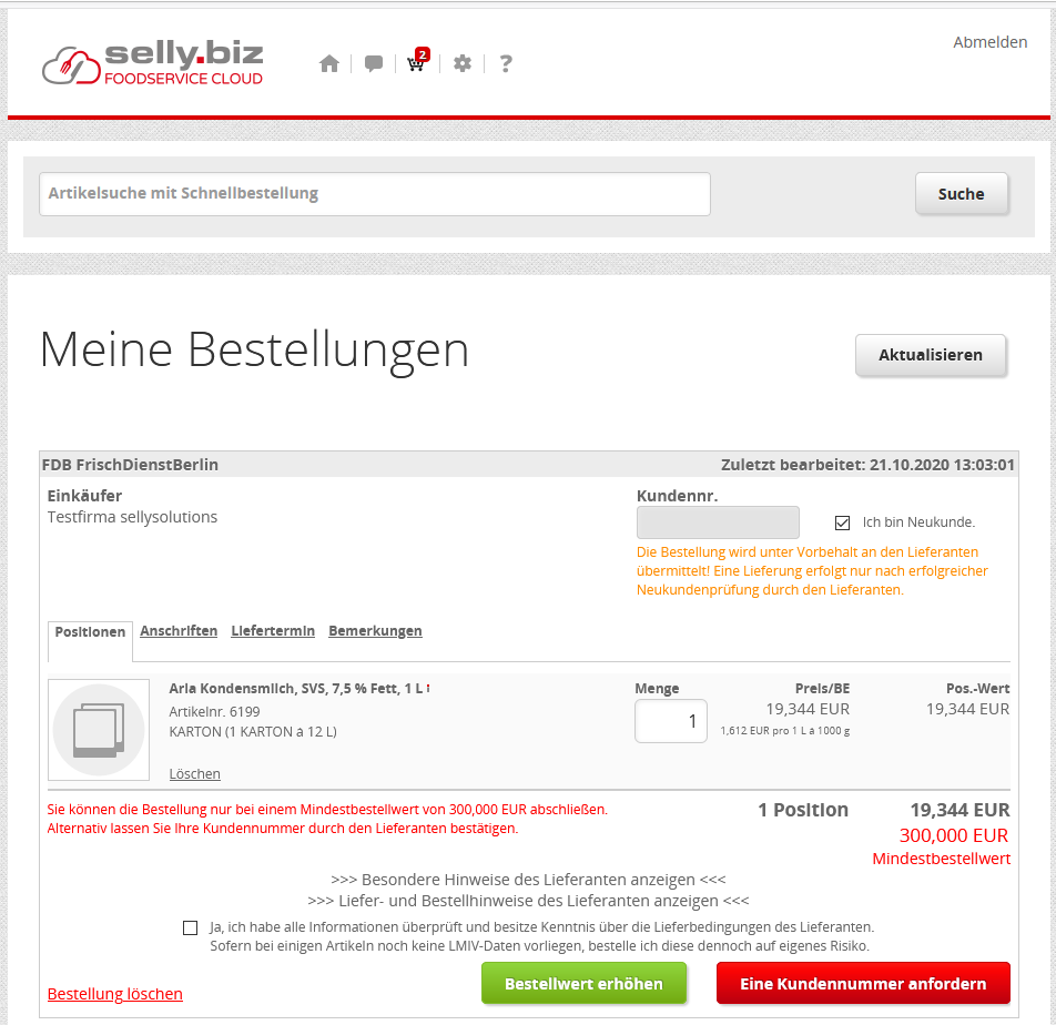 Analog gilt dieses für Artikel, die durch den Kundennummernwechsel nicht mehr im, für die Kundennummer freigeschalteten Sortiment, existieren, dann erhält dieser