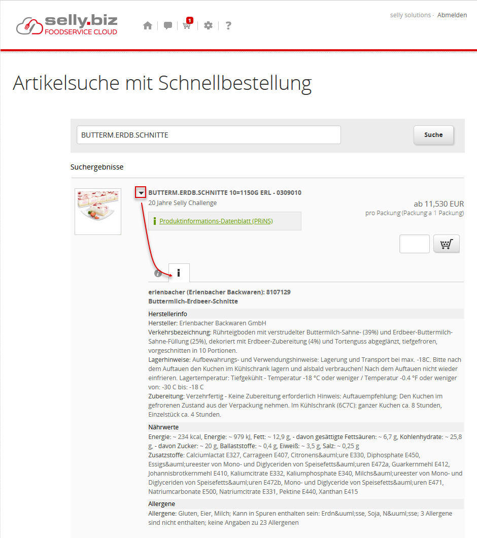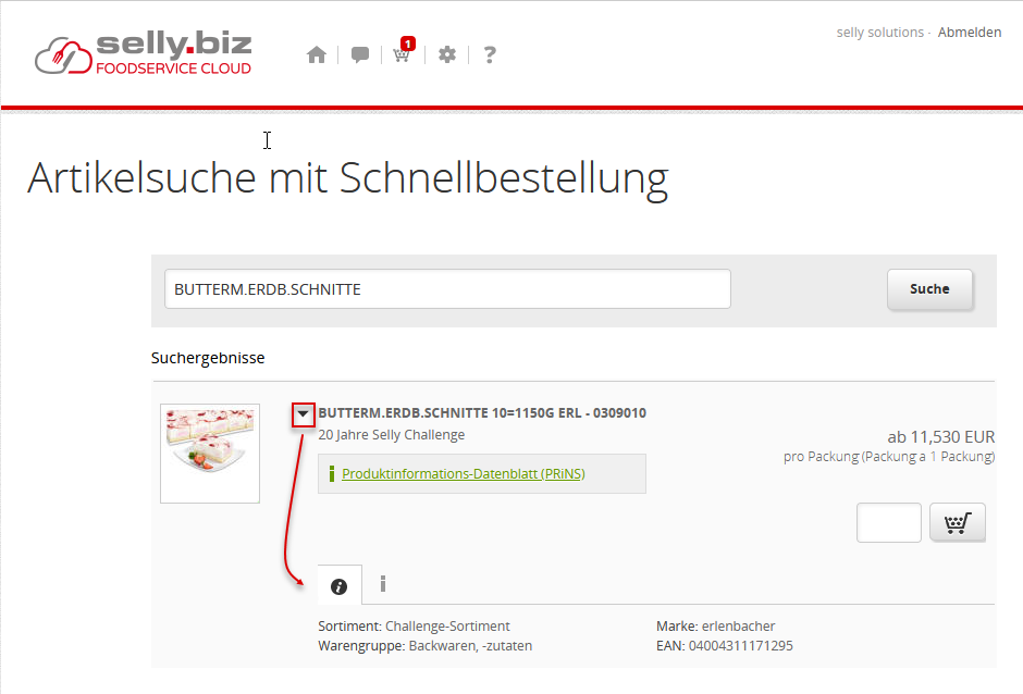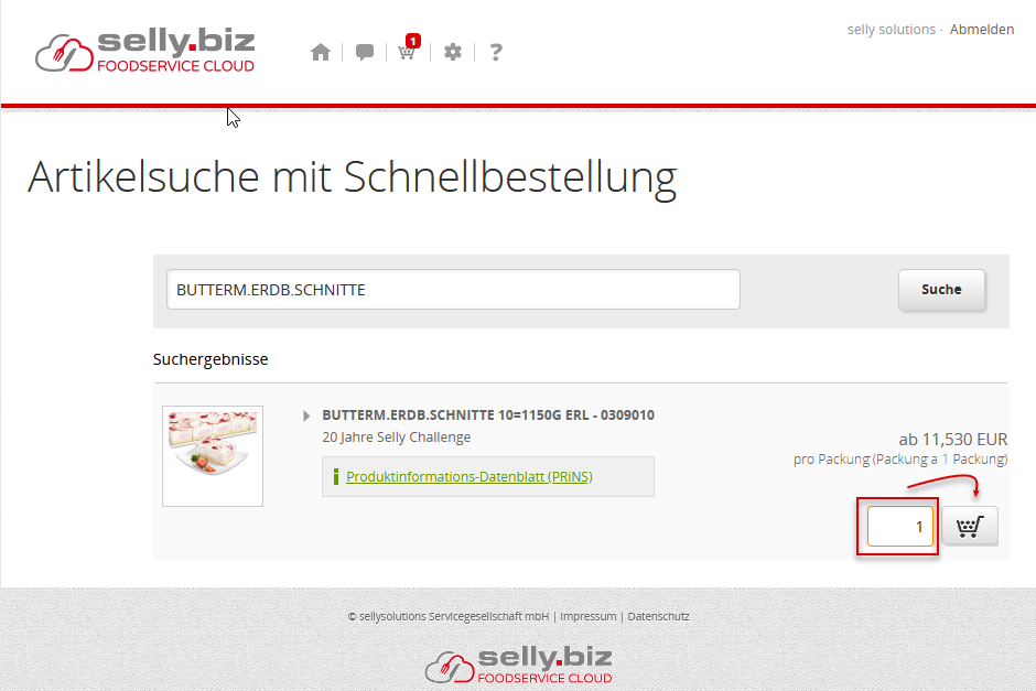 Artikel aus der Ergebnisliste in den Warenkorb zu übernehmen, tragen Sie eine Bestellmenge ein und klicken auf den Wagenkorb