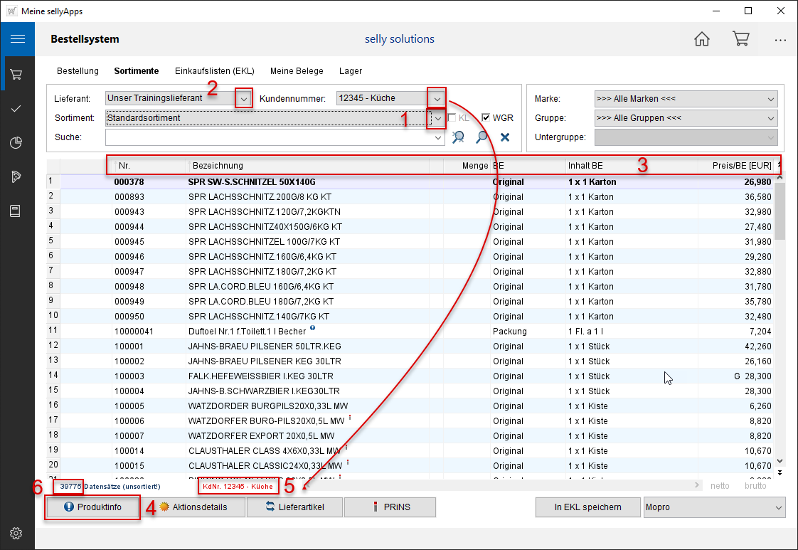Die zum gewählten Lieferanten hinterlegten Sortimente werden in der Auswahlliste Sortiment (s. o. Markierung 1) angezeigt. Sie wählen durch Anklicken des Eintrages in der Liste ein Sortiment aus und erhalten in der unteren Tabelle die dazugehörigen Artikel aufgelistet.