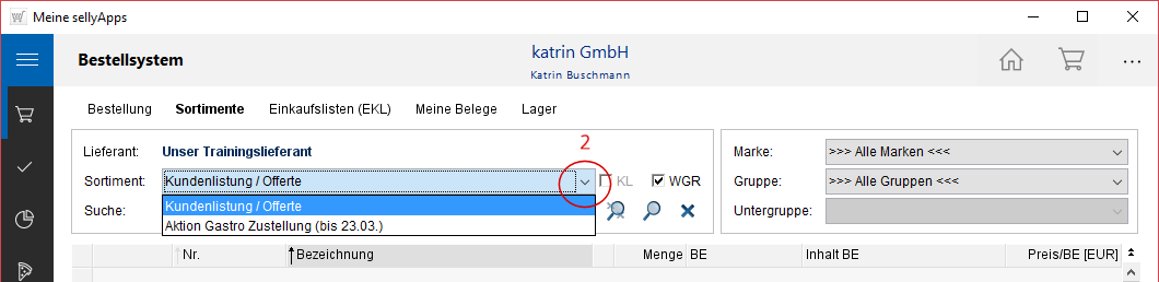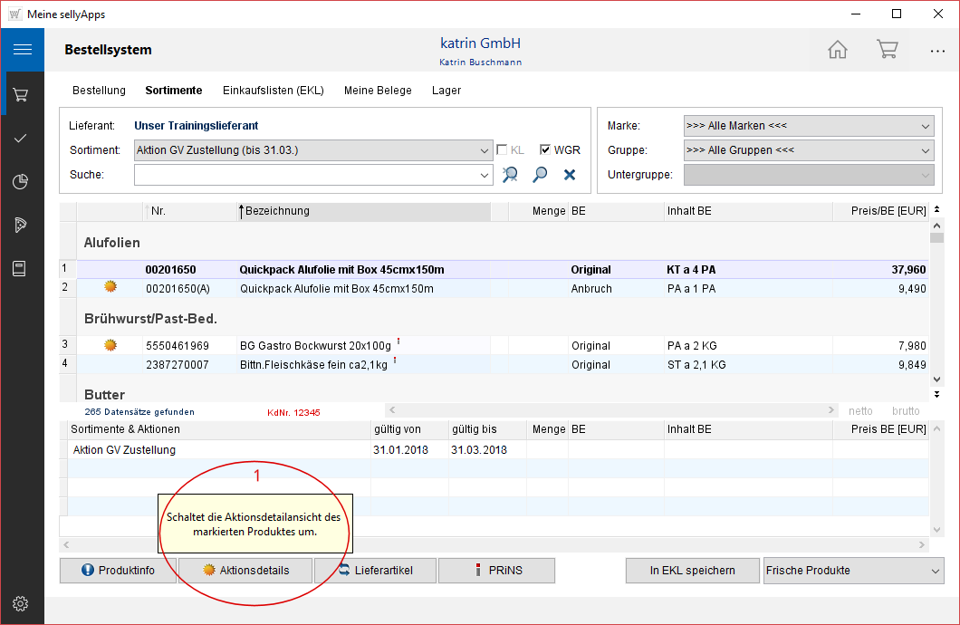 Wenn ein Produkt markiert ist, und die Aktionsdetails zugeschaltet sind (s. Markierung 1), werden in der unteren Liste alle Aktionen und Sondersortimente, in denen das Produkt enthalten ist, angezeigt.