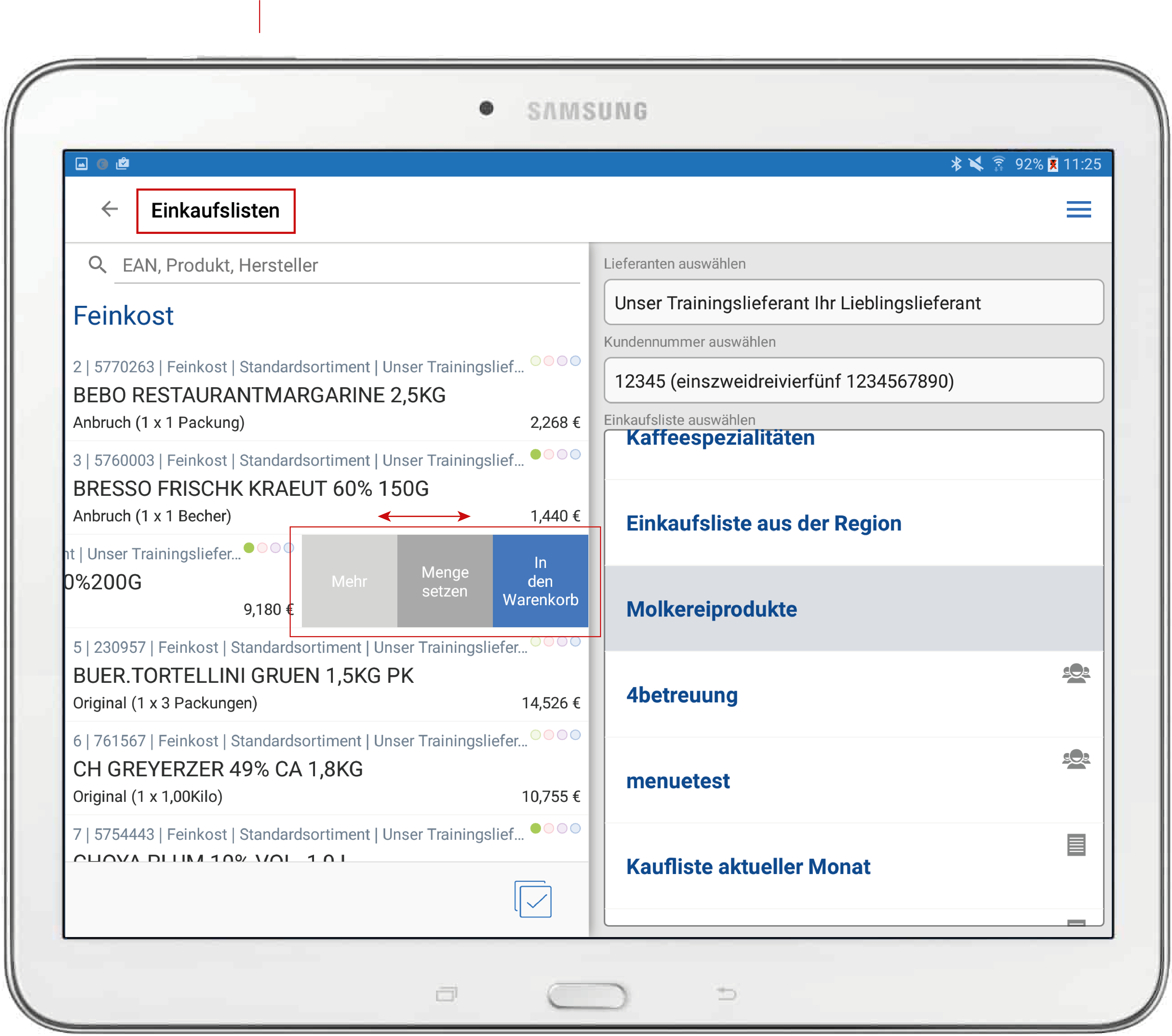 (Artikel in Einkaufs- und Kühlhausliste und Warenkorb übernehmen, Bestellmenge eintragen)