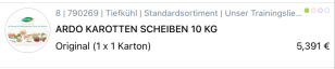Die Artikelbezeichnung (ARDO KAROTTEN SCHEIBEN 10 KG), die Bestelleinheit (Original (1 x 1 Karton)) und der Preis (5,391 €) werden angezeigt.