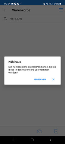 Wechseln Sie in einen Warenkorb, wird geprüft, ob eine Kühlhausliste existiert und die Übernahme der Artikel angeboten.