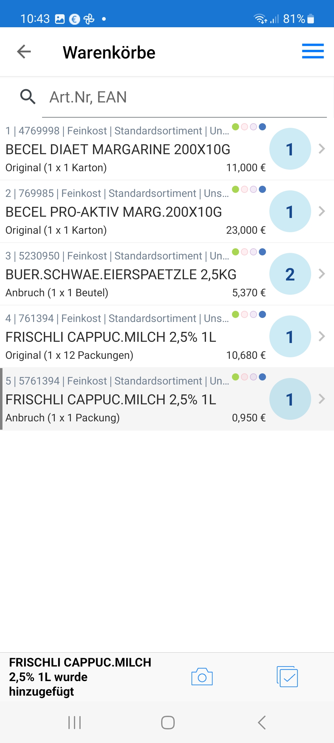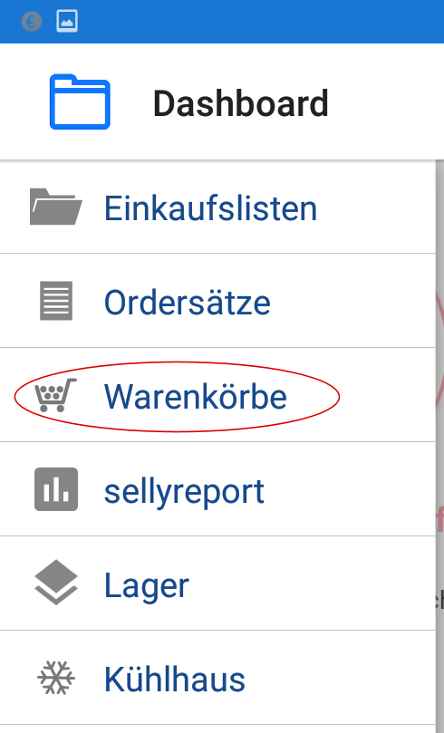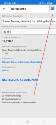 Sie wählen den Warenkorb über das Menü-Icon (s. Markierung) und sehen jeweils eine vorbereitete Bestellung, können hier ggfs. weitere Artikel zuordnen oder auch die Bestellung abschließen.