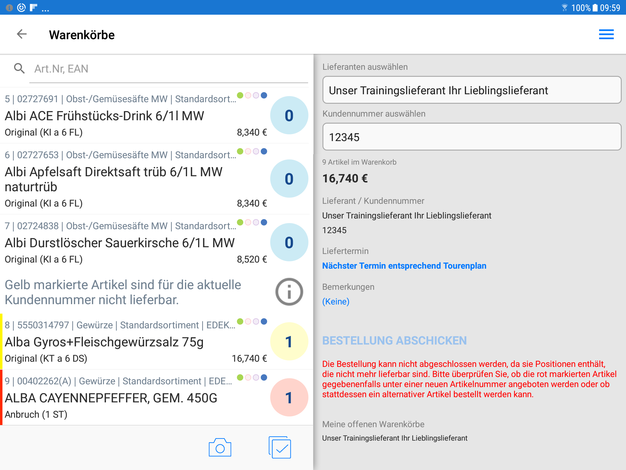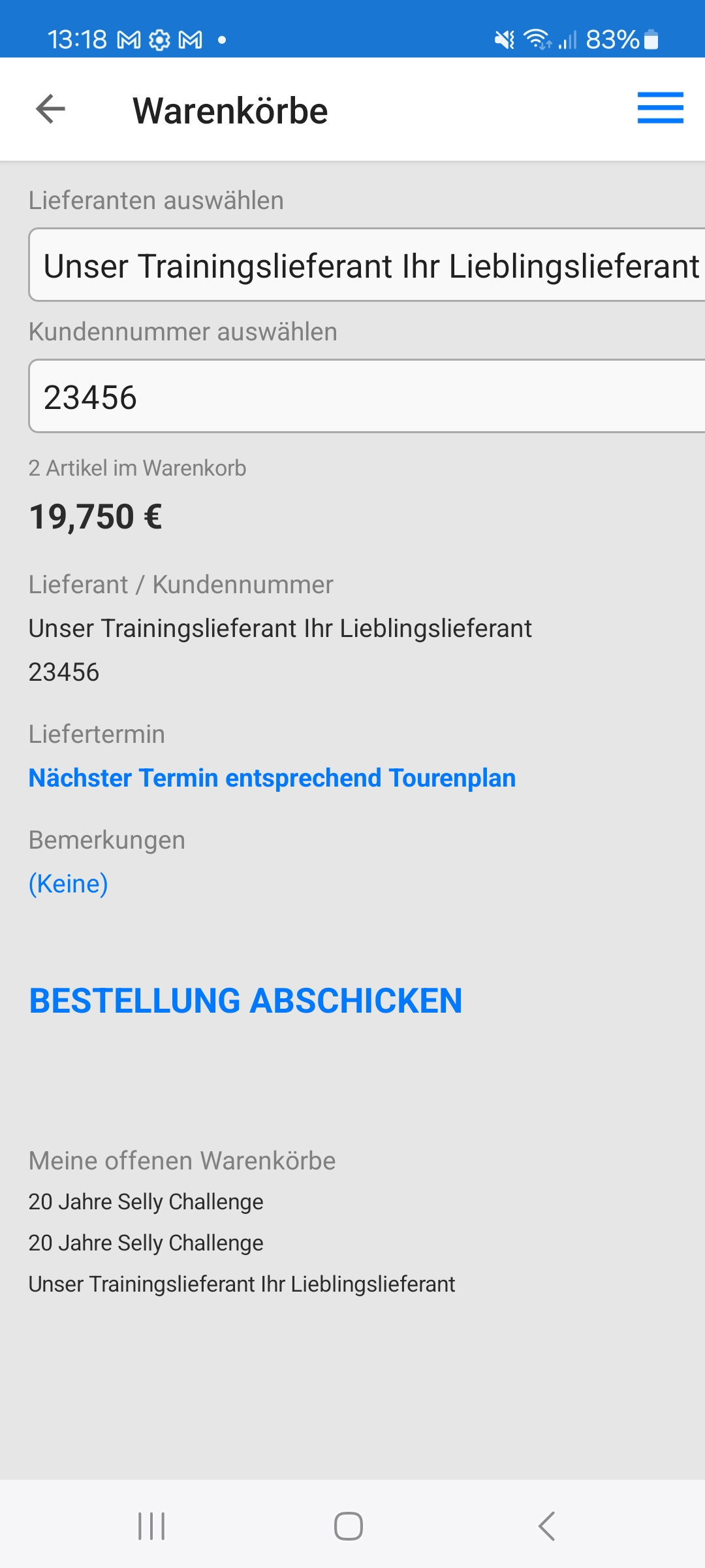 Haben Sie einen Warenkorb vollständig bestückt, erledigen Sie im Bereich Warenkörbe den Bestellabschluss.