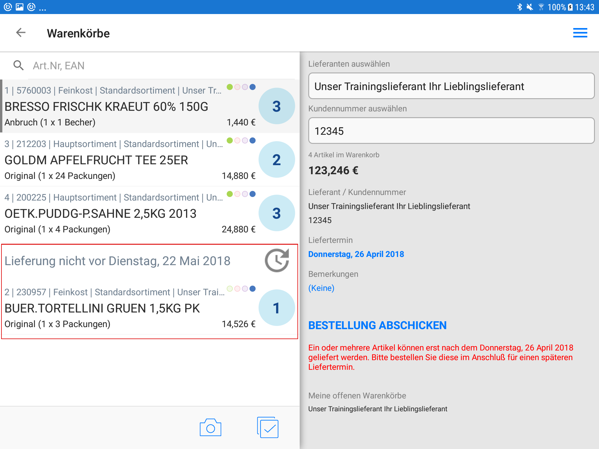 Standardmäßig ist der Liefertermin laut Lieferrhythmus aktiviert. Sie können aber auch einen abweichenden Termin eingeben.