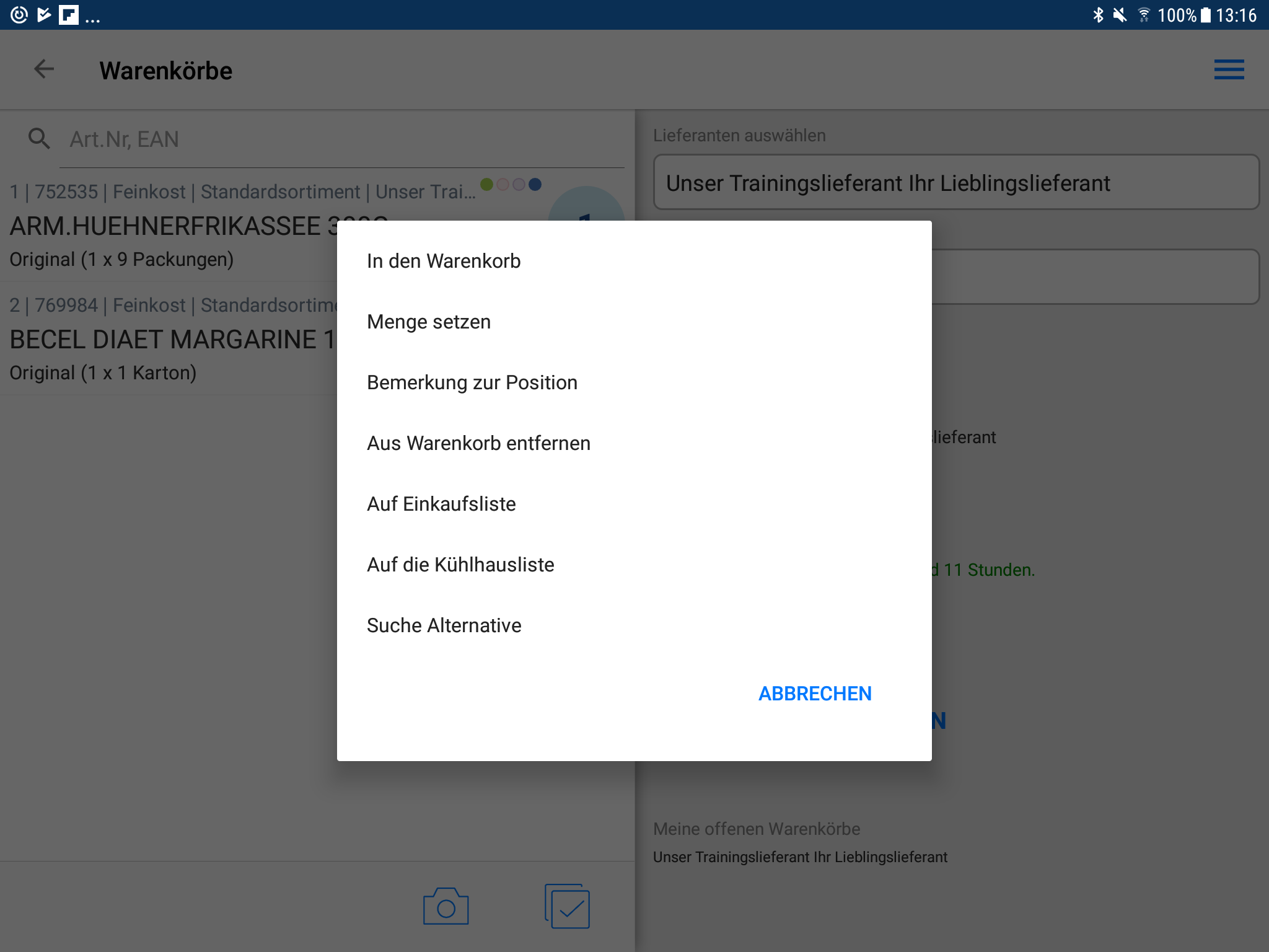 Im Bereich der Ordersätze, Ihrer Einkaufslisten und der Lagerliste haben Sie die Möglichkeit, Artikel in den